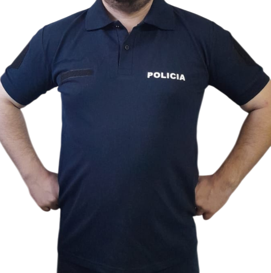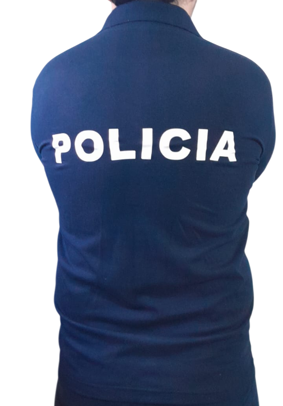 CHOMBA CONFECCIONADA EN PIQUE DE ALGODÓN, ESTAMPADA CON VINILO LA PALABRA "POLICIA" EN ESPALDA Y PECHO.