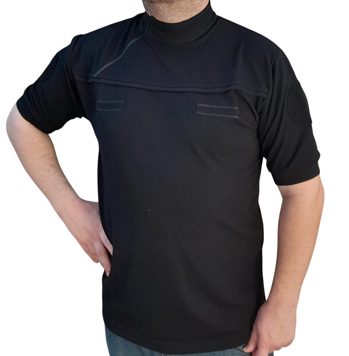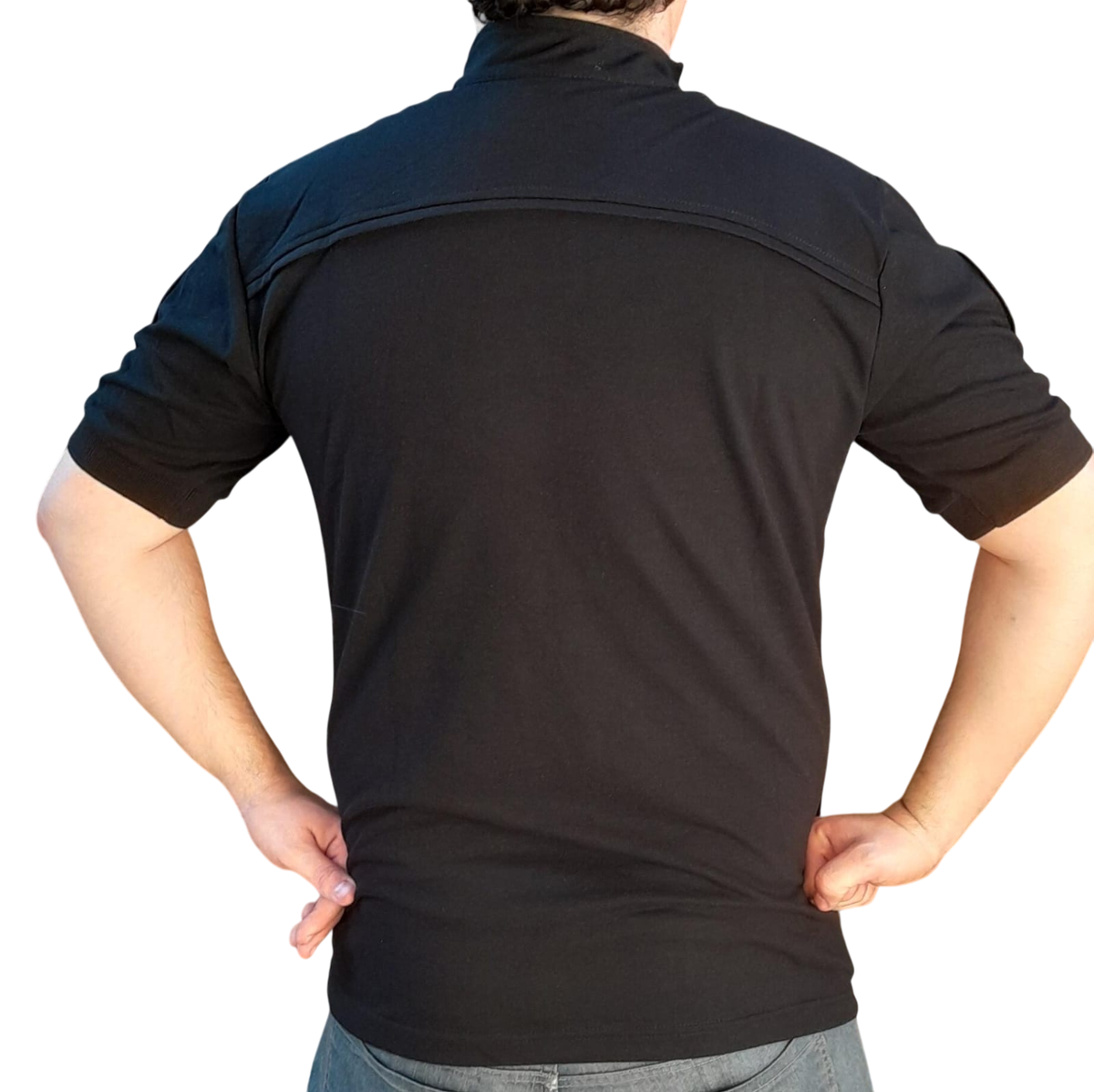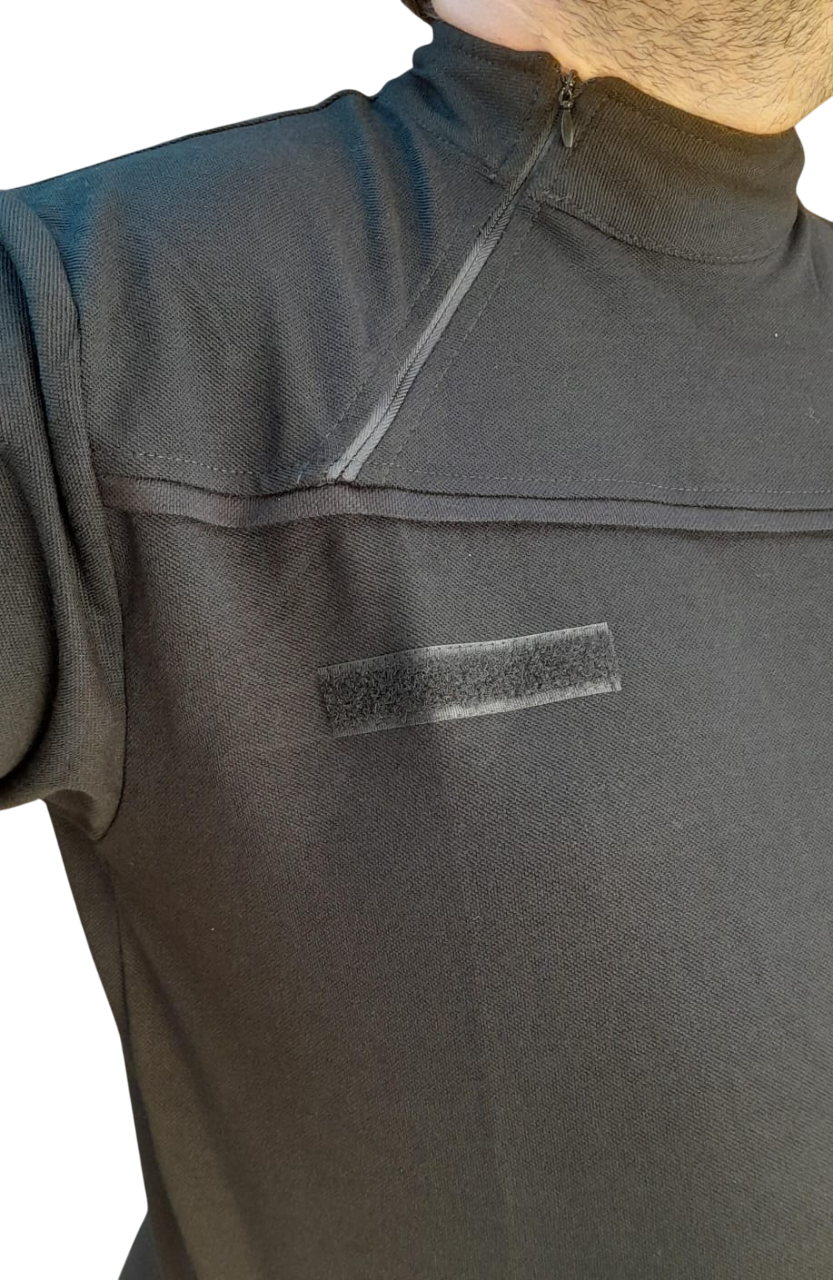CHOMBA CONFECCIONADA EN PIQUE DE ALGODON CON CIERRE CRUZADO Y ABROJOS EN MANGAS Y PECHO PARA PARCHES.
